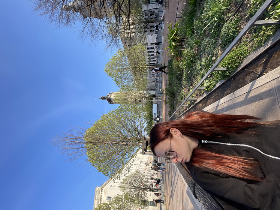The image depicts an outdoor urban scene on a clear, sunny day, likely in spring, at Place des Terreaux, Lyon, France. In the foreground, a young adult female with long, straight, reddish-brown hair and clear-framed eyeglasses is seated on a light-colored public bench, turned to her right and looking out of frame. She wears a dark, possibly black, zip-up jacket and a silver hoop earring in her visible left ear. To her right, a raised planter bed with green foliage and a metal railing separates the foreground from the wider public square in the background. The background features a broad plaza or boulevard under a bright blue sky. Dominating the central background is the Hôtel de Ville de Lyon, identifiable by its distinctive clock tower with a black dome and a cross at its apex. To the left and right of the tower are large, multi-story classical buildings with white facades and ornate architectural details. Scattered throughout the plaza are trees with sparse, light green spring foliage. Numerous pedestrians are visible, some walking across the plaza, others seated on distant benches. A white van is also visible in the mid-background. Sunlight casts shadows, suggesting either morning or late afternoon.
