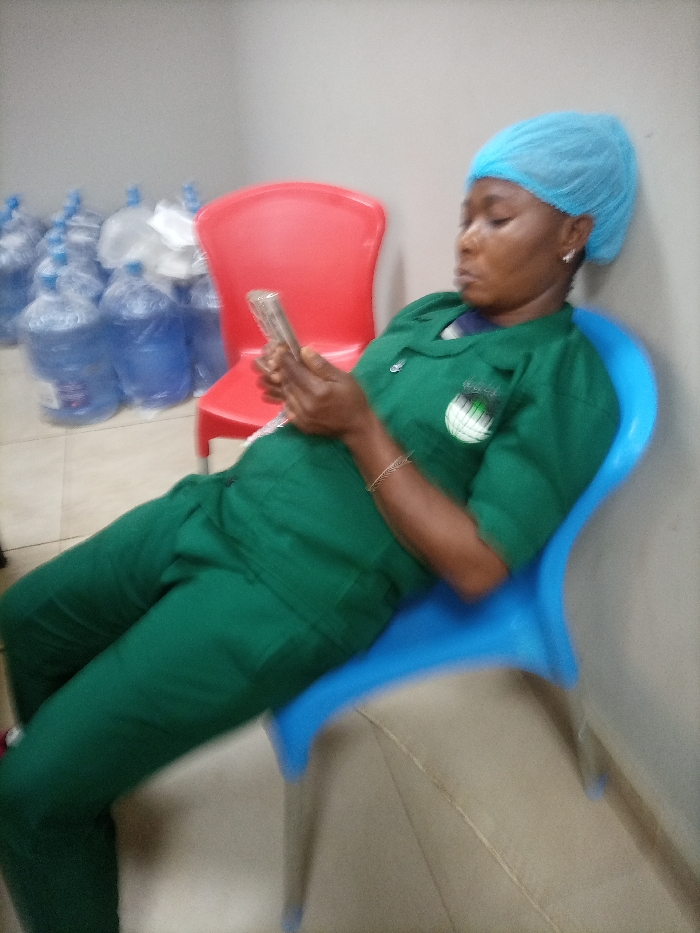 An African woman wearing a green uniform and a blue hair net sits in a blue plastic chair while looking at a mobile phone. She is positioned near a red plastic chair and a row of large water bottles against a white wall. She is wearing a bracelet on her left wrist. The scene appears to be indoors.