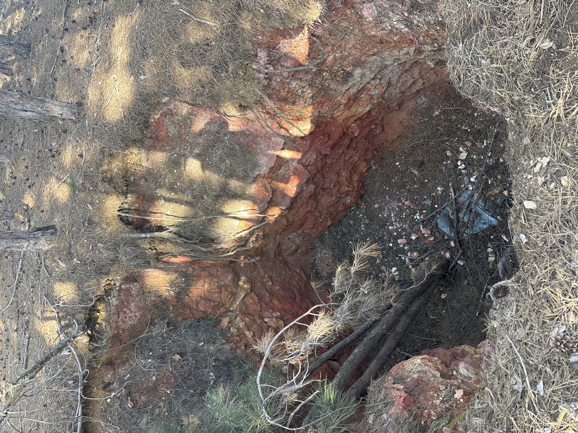 hole in the ground in a forested area near Kalugerovo, Bulgaria. The hole has exposed reddish-brown rock and is surrounded by pine needles, branches, and other forest debris. There is some trash visible at the bottom of the hole. No people are visible.