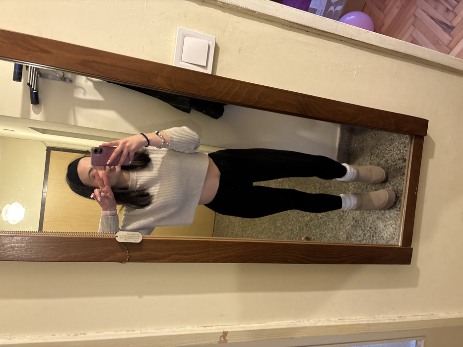 An individual is depicted in an indoor setting in Radomir, Bulgaria, taking a mirror selfie. The subject, a female with dark hair secured by a black headband, is wearing a light grey ribbed crop top, black leggings, white socks, and tan platform boots. She holds a purple-cased smartphone in her right hand, extending her left hand to display a "peace" sign. The individual's midriff is exposed. The full-length, vertically oriented mirror features a dark wooden frame, from which a silver dog tag on a bead chain hangs from the upper left corner. The immediate environment outside the mirror frame includes a light-colored wall (cream/yellowish) with a white rectangular light switch and a silver wall-mounted rack or hook to the right. A light-colored wooden door frame is visible on the left. Reflected in the mirror is a light-colored wall, a dark wooden door in the distance, a ceiling light fixture, and a light-colored, possibly terrazzo, floor. To the far right, partially visible beyond the mirror, is a wooden floor with a herringbone pattern and a pink balloon resting near the floor.