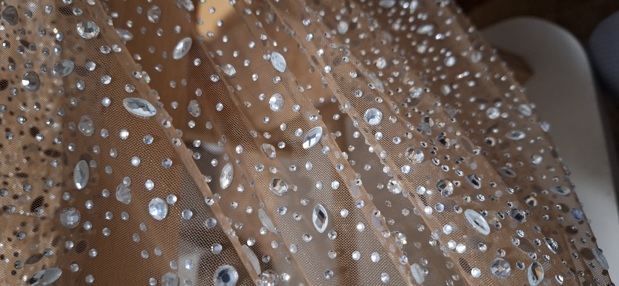close-up of a piece of light brown mesh fabric heavily adorned with clear rhinestones