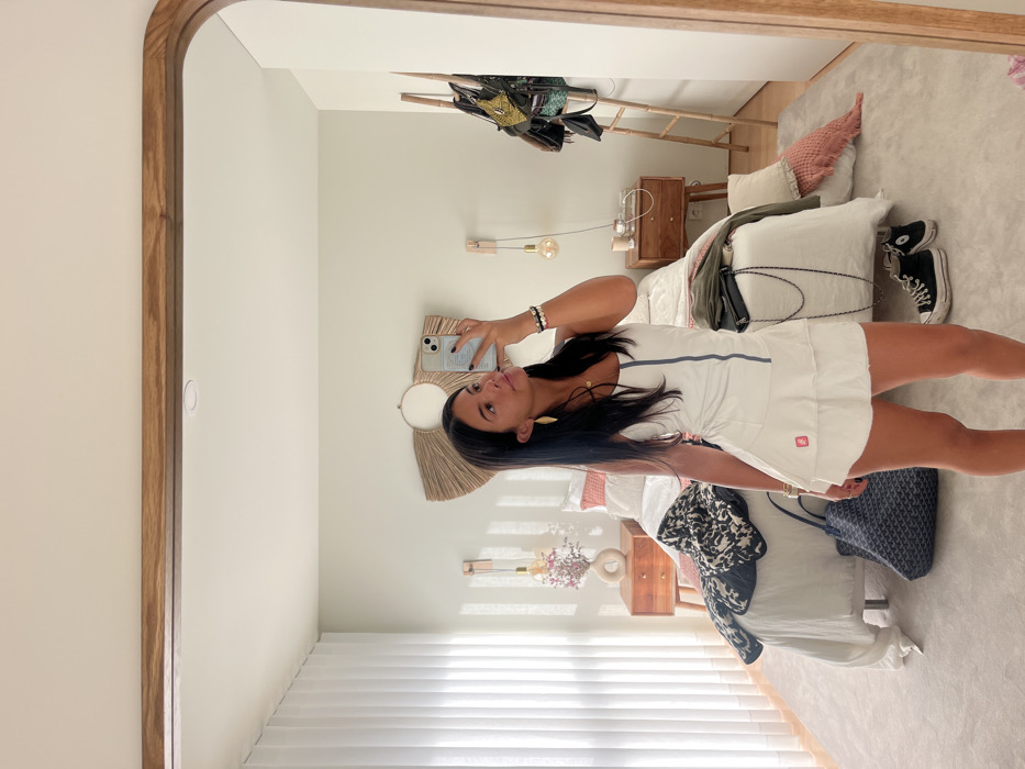 This image captures a residential bedroom scene in Lordelo do Ouro e Massarelos, Portugal. The primary subject is a young female, positioned centrally and facing a mirror to take a selfie. She wears a white athletic-style sleeveless top with a central blue zipper and a matching tiered white mini-skirt, which features a small red square emblem on the left hip. Her long, dark hair is down. She accessorizes with gold leaf-shaped earrings, a delicate gold necklace, and multiple bracelets on her left wrist. A light-colored smartphone is held in her right hand, partially obscuring her face as she photographs her reflection. The bedroom features light sage green walls and a light grey carpet. A large bed with white bedding and a visible headboard occupies the central space. On either side of the bed are wooden bedside tables. The left table holds a round vase containing dried floral arrangements and is surmounted by a wooden wall sconce with an exposed bulb. The right table contains small unidentified objects and a matching wall sconce. Above the bed, a semicircular woven wall hanging with a central mirror is affixed. Natural light enters the room from a large window on the left, fitted with white vertical blinds. On the right, a bamboo ladder acts as a storage rack, draped with various bags and clothing items. Additional garments, including a black and white patterned blanket and an olive green top, are casually placed on the bed. A dark grey patterned tote bag and a pair of black high-top sneakers are visible on the carpeted floor. The room presents a lived-in, contemporary aesthetic.