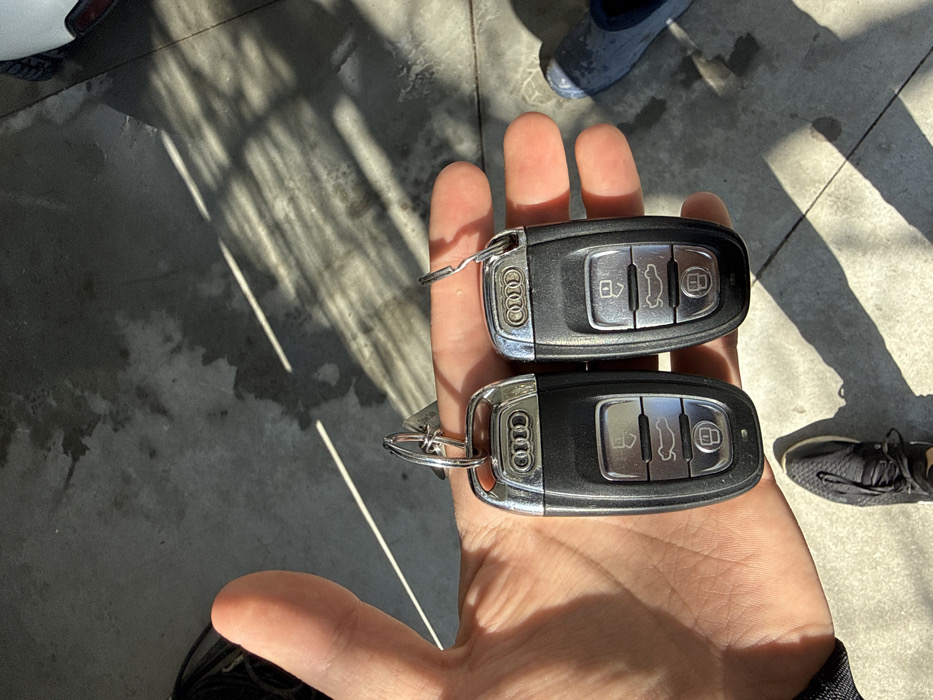 - "A human hand, primarily illuminated by direct sunlight, holds two black Audi car key fobs" by FM-AnqY53, licensed under CC BY 4.0
