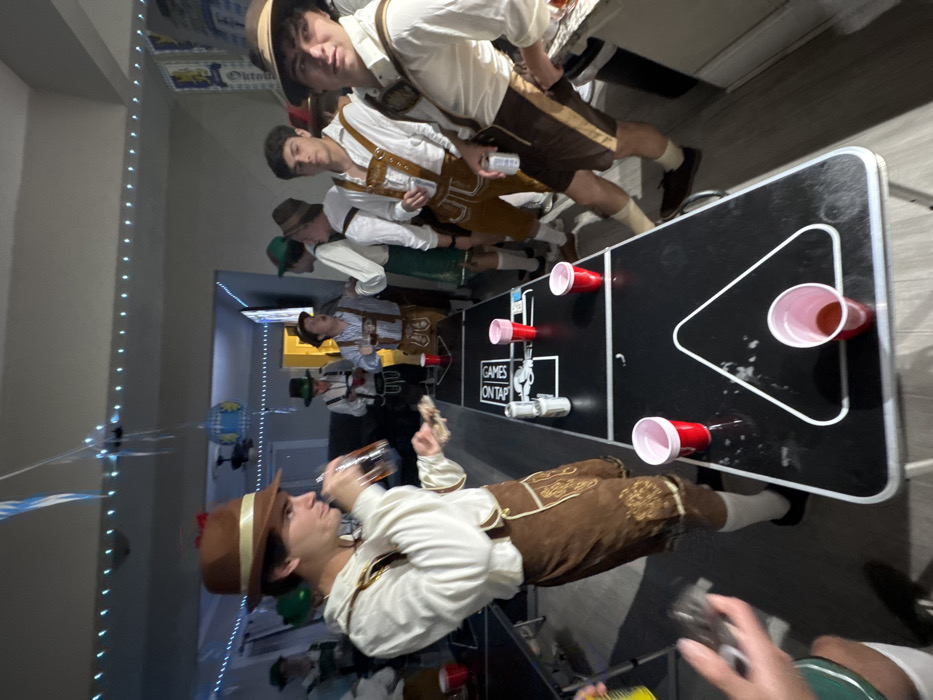 This image depicts an indoor social gathering of approximately ten young adult males in a residential setting in South Bend, United States. All identifiable individuals are dressed in Bavarian-themed attire, consisting of lederhosen-style shorts or pants, white or cream-colored long-sleeved shirts, and various hats including brown fedoras and green alpine hats. The central foreground features a male subject in a brown fedora and brown lederhosen, consuming liquid from a dark bottle and holding a small, flat food item. Immediately to his right, a black folding table, set up for beer pong, displays white markings for cup arrangement, including two triangular outlines. Multiple red plastic cups, some containing liquid, and two silver beverage cans are present on this table. On the right side, another male subject in similar attire, wearing a brown hat, stands with a silver beverage can, looking directly toward the camera. Additional males in themed costumes are positioned in the mid-ground and background, standing and engaged in conversation or observation. The environment includes blue and white decorative streamers and string lights suspended from the ceiling. A blue and white patterned banner is affixed to a wall on the right. A dark sofa is partially visible in the distant background. The flooring is a light-toned hard surface. The scene portrays a themed party atmosphere.