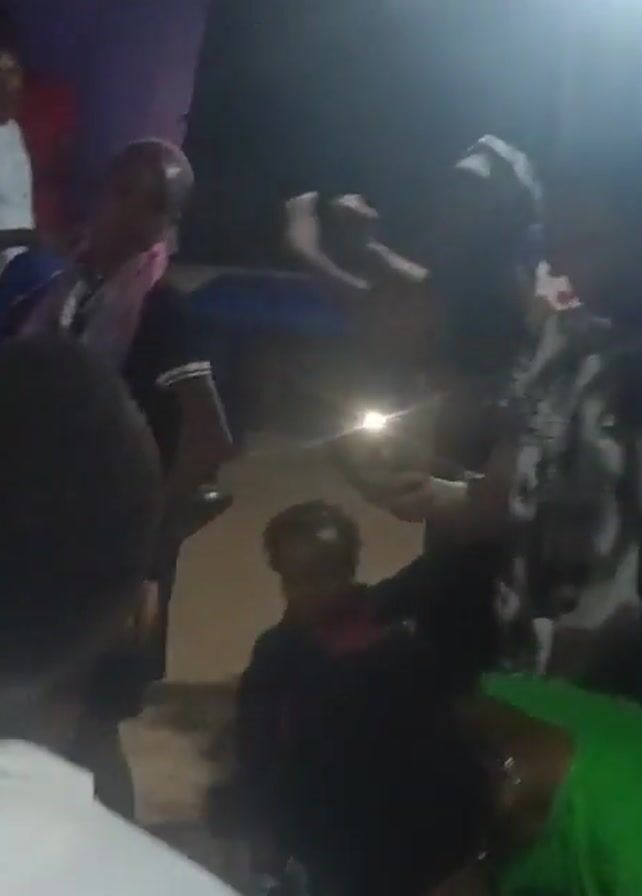 group of people dancing and celebrating outdoors at night. Most individuals are moving to the music, with some filming or taking photos with their phones. Some wear traditional clothing, while others wear more casual attire. The area is lit with bright lights, and there is some decor in the background. A young child is also present, watching the festivities.
