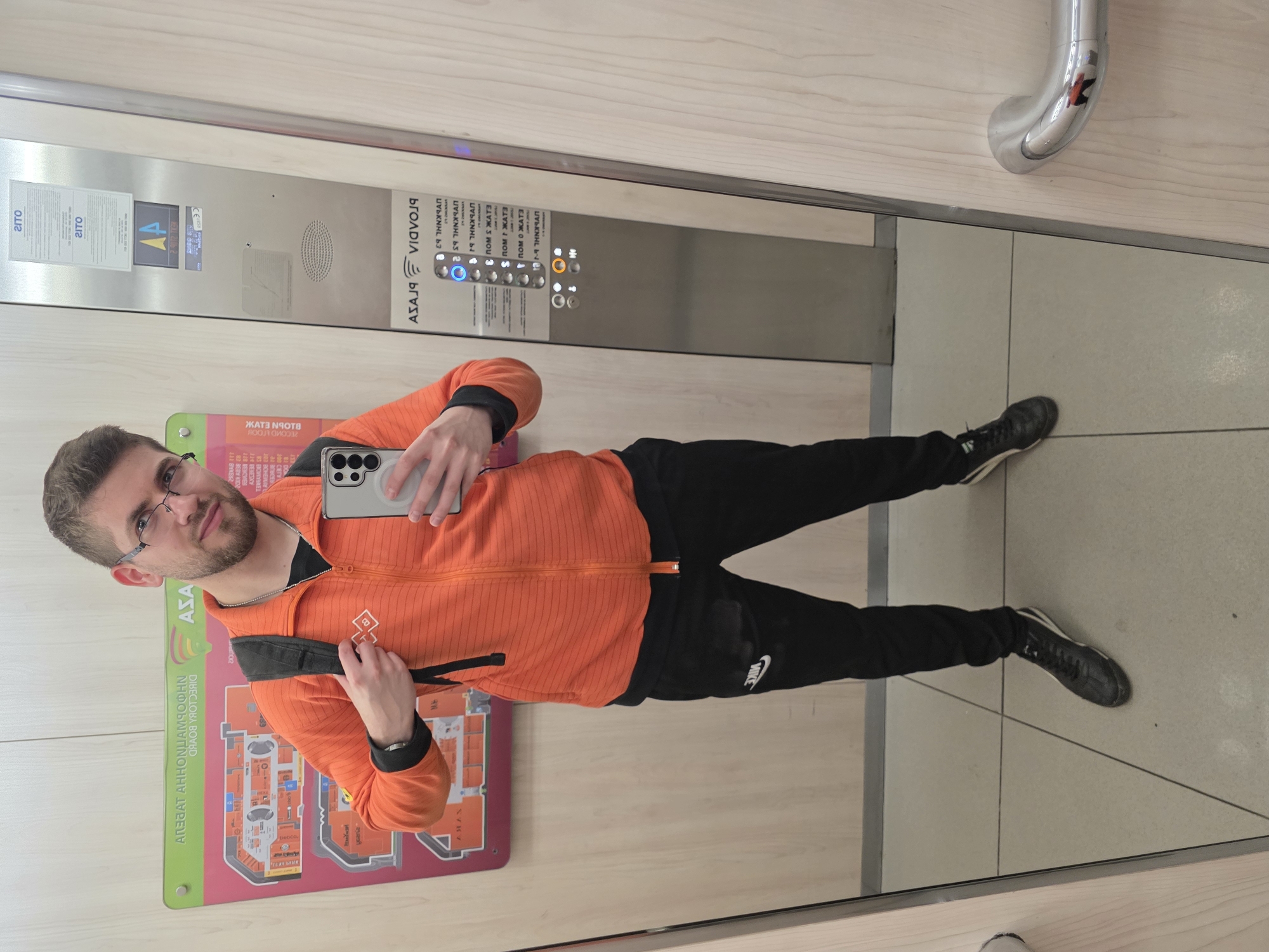 The image depicts a man taking a selfie in an elevator. He is wearing an orange jacket, black pants, and black sneakers with white stripes. He is holding a smartphone with a distinctive camera array. The elevator's interior is visible. The elevator panel shows buttons for floors, with markings in Bulgarian. There is also signage indicating a shopping mall, possibly the "ASAJAVIO" (BROADWAY) PLAZA, based on the reversed text visible on the panel. The mall floor map signage is visible. Based on the signage, this location is likely within the city of Plovdiv, Bulgaria, where the "ASAJAVIO" PLAZA is located.
