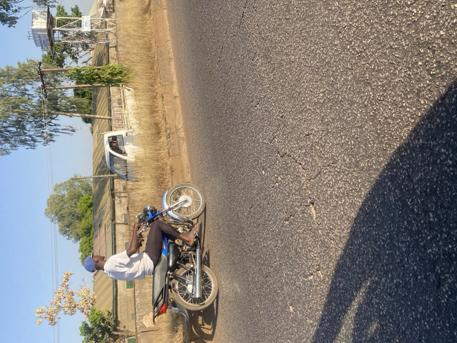 The scene in Kakuri Gwari, Nigeria, depicts an outdoor roadside environment under clear daylight. In the midground, a dark-skinned male individual, wearing a light-colored short-sleeved shirt, dark trousers, and a blue baseball cap, is seated on a blue and silver standard motorcycle. The motorcycle is stationary at the edge of the asphalt road, with the rider's bare right foot on the ground. He is looking towards the left of the frame. Behind the motorcycle, a raised embankment covered with dry, light-brown grass separates the road from the background. Partially obscured by this grass is the front section of a white, single-cab pickup truck. Within the truck's cab, a second dark-skinned male individual is visible, looking towards the right. The background includes multiple low-rise buildings with light-colored walls and green corrugated roofs. A utility pole with wires is visible, and to the far right, a metallic water tower supporting a white tank, featuring a partially legible sign, stands against a clear blue sky. The asphalt road in the foreground displays numerous surface cracks.
