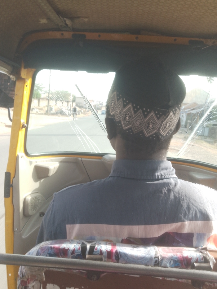 The image presents a forward-facing view from inside a yellow commercial tricycle (keke napep) in Jos, Nigeria