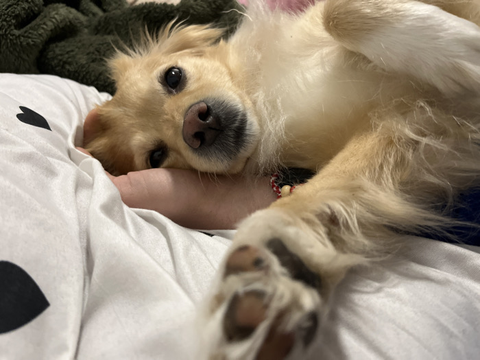 - "The image displays an indoor scene featuring a single light-colored dog resting on its back or side" by FM-m1kZq2, licensed under CC BY 4.0
