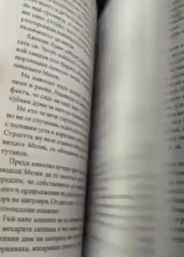 hand flipping through the pages of a book titled "Sabahattin Ali, Izbrani Razkazi" (Sabahattin Ali, Selected Stories). The book appears to be in Bulgarian. The background is black.