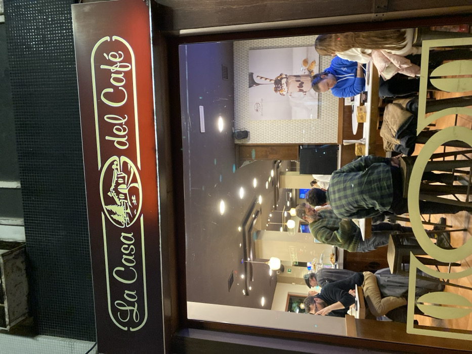 exterior view of "La Casa del Café" with its sign on display. Inside, people are seated at tables, engaged in conversations or activities. A large poster depicting a dessert item hangs on the wall. The interior lighting casts reflections on the windows, adding depth to the scene. The ambiance appears relaxed and inviting, suggesting a typical café setting.