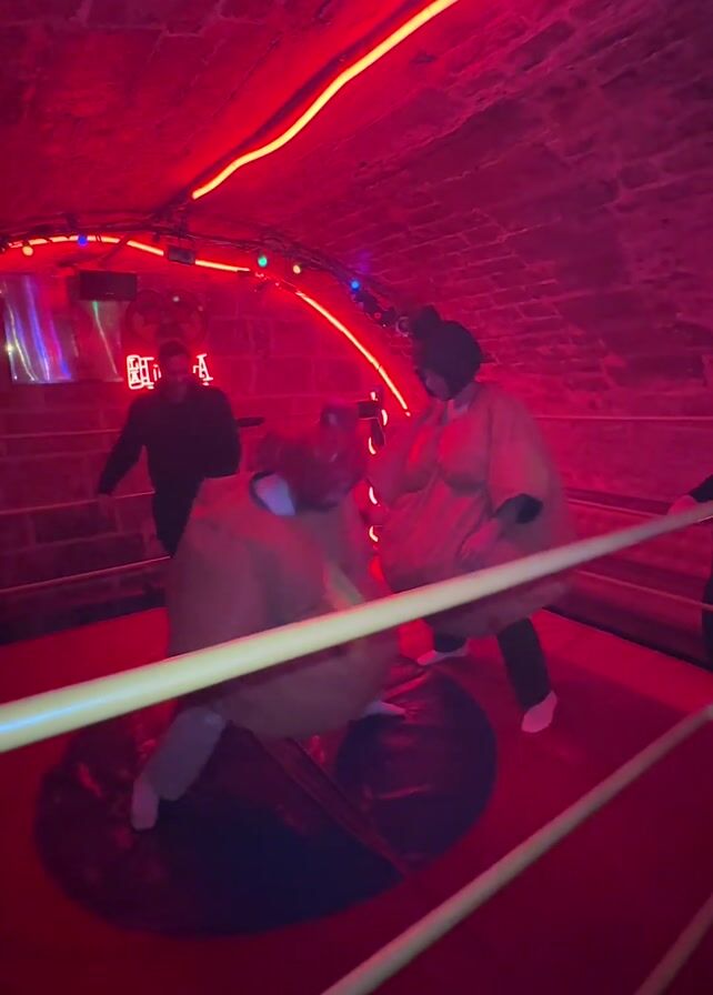In a small, red-lit room with a brick-arched ceiling, two people are engaged in what appears to be a wrestling match
