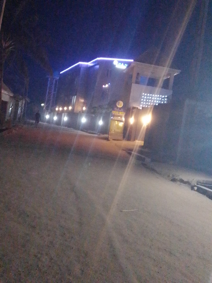 A dimly lit street at night. A multi-story building on the right has blue neon trim and a sign. Several evenly spaced lights line the front. A person walks along the street in the distance. Buildings are also visible on the left. The street surface is somewhat uneven. There are strong light flares.