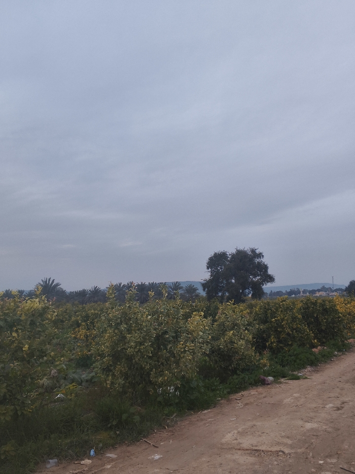 A landscape features an overcast sky above rows of lush green vegetation. In the foreground, bushes line a dirt path. A large, leafy tree stands amidst the vegetation, breaking the even rows. Palm trees are visible in the midground, adding a tropical touch. Distant hills and a few buildings can be seen on the horizon under the cloudy sky.