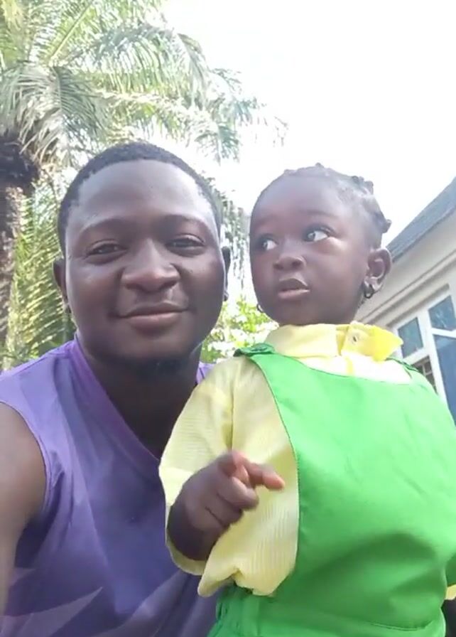 A man and a young child stand together in front of a palm tree and a white building. The man is wearing a purple tank top and smiling at the camera. The child is wearing a green and yellow school uniform and looking to the side. The man points his finger toward the child, then raises it in the air. The child also raises her finger, then looks up.