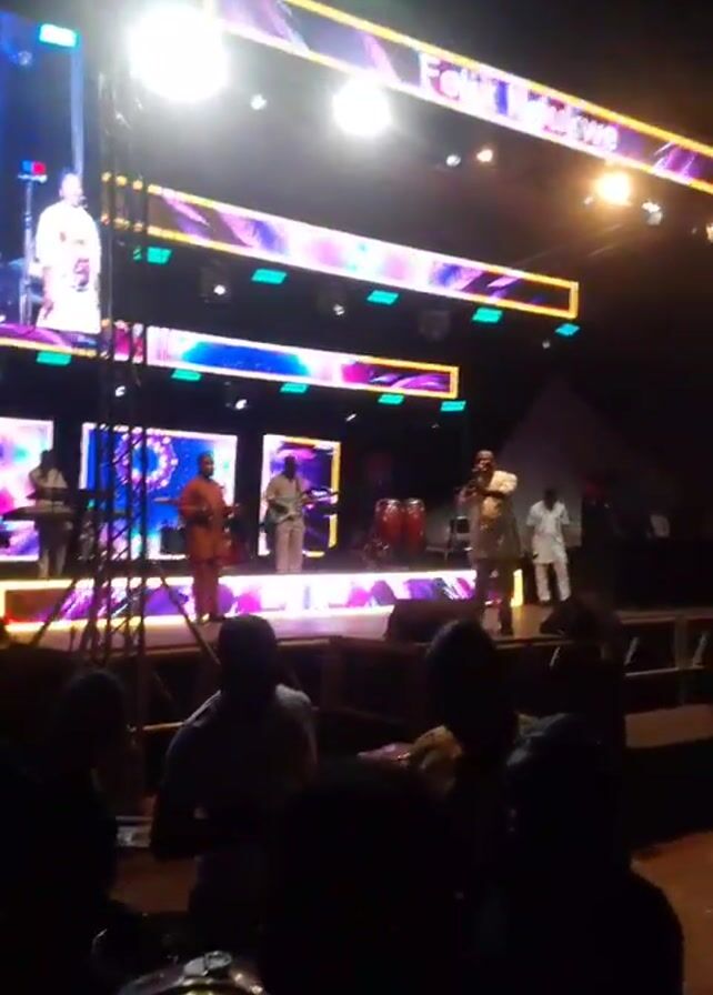 live performance by Felix Ndukwe. He is on stage, singing into a microphone, wearing a white outfit. He is surrounded by his band, who are playing instruments. The stage is brightly lit with colored lights. There are large screens displaying images. In the audience are silhouetted figures. One security guard is standing near the stage. The video appears to have been taken at a concert.