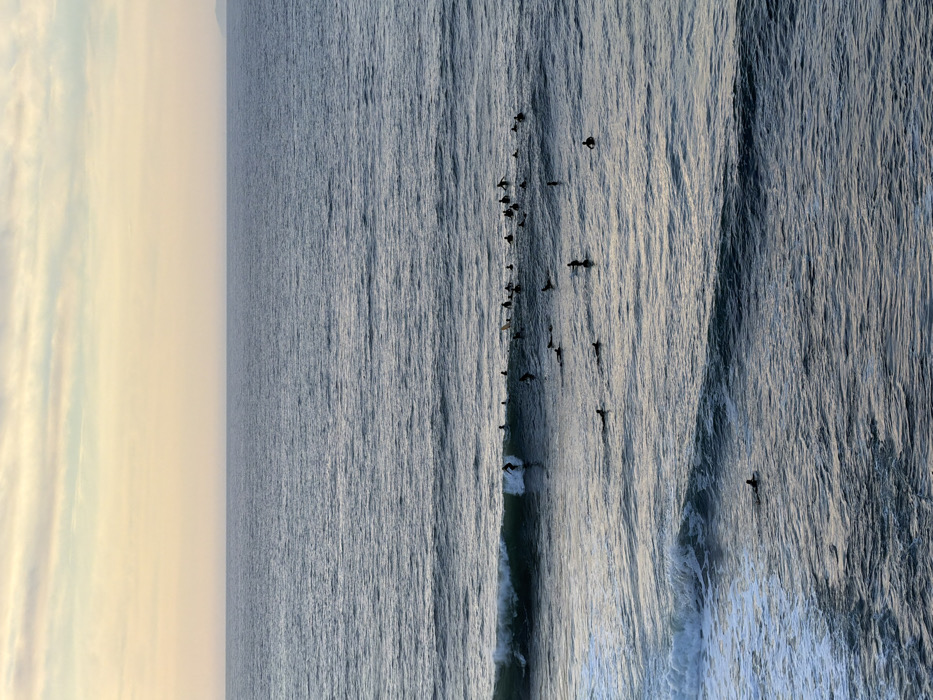 A panoramic shot shows a sea or ocean stretching from left to right. The left side of the image displays a gradient sky, transitioning from light to dark. The water dominates the right side, exhibiting small choppy waves and subtle color variations. Dark figures, possibly surfers, are scattered across the water, some aligned in a visible row, suggesting a group waiting for a wave. The water exhibits slight wave formations toward the right edge.