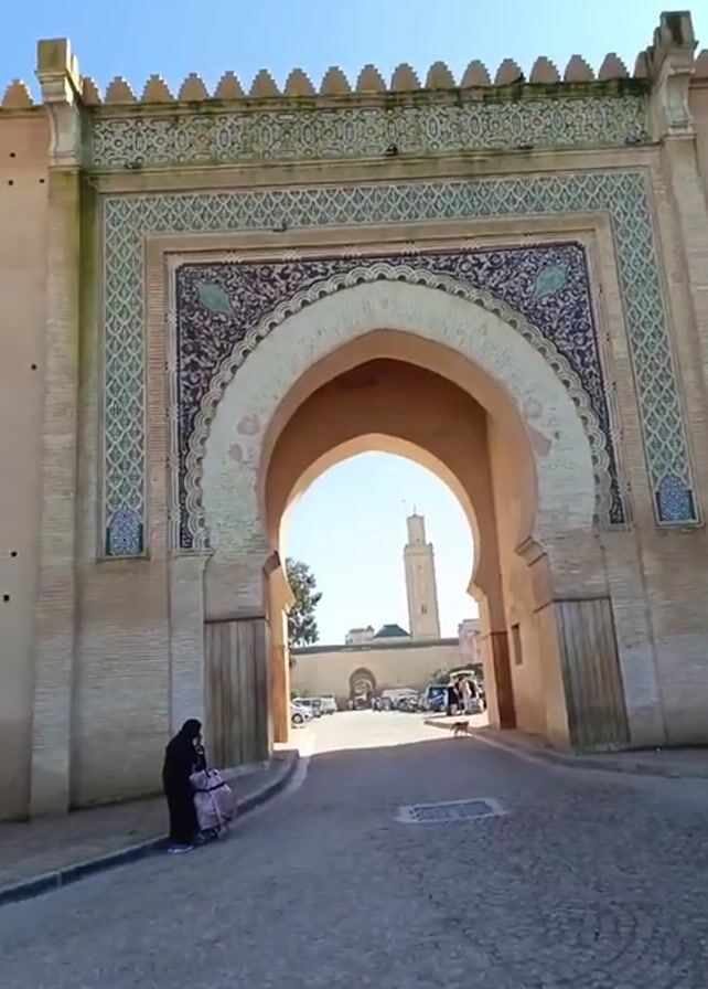 n ornate archway with intricate tile work, leading into a street scene with a minaret in the background. A woman dressed in a black robe stands near the archway, pulling a shopping cart. The camera pans from the archway to the adjacent wall, a high, fortified structure with crenellations and evenly spaced square openings. A tall, weathered lamppost stands near the wall. The sky is clear and blue.