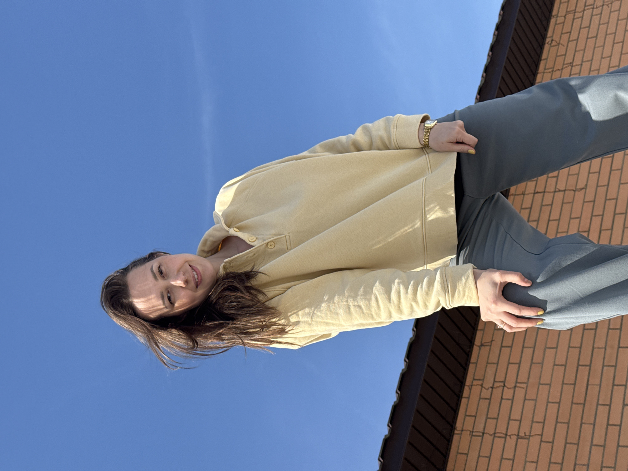 A young woman is standing outdoors in Chaikovsky, Russia. She is positioned against a backdrop of a clear blue sky and the corner of a brick building with a dark roofline. She wears a light yellow button-down sweater and gray pants. A gold wristwatch is visible on her left wrist, and her fingernails are painted yellow. She smiles at the camera.