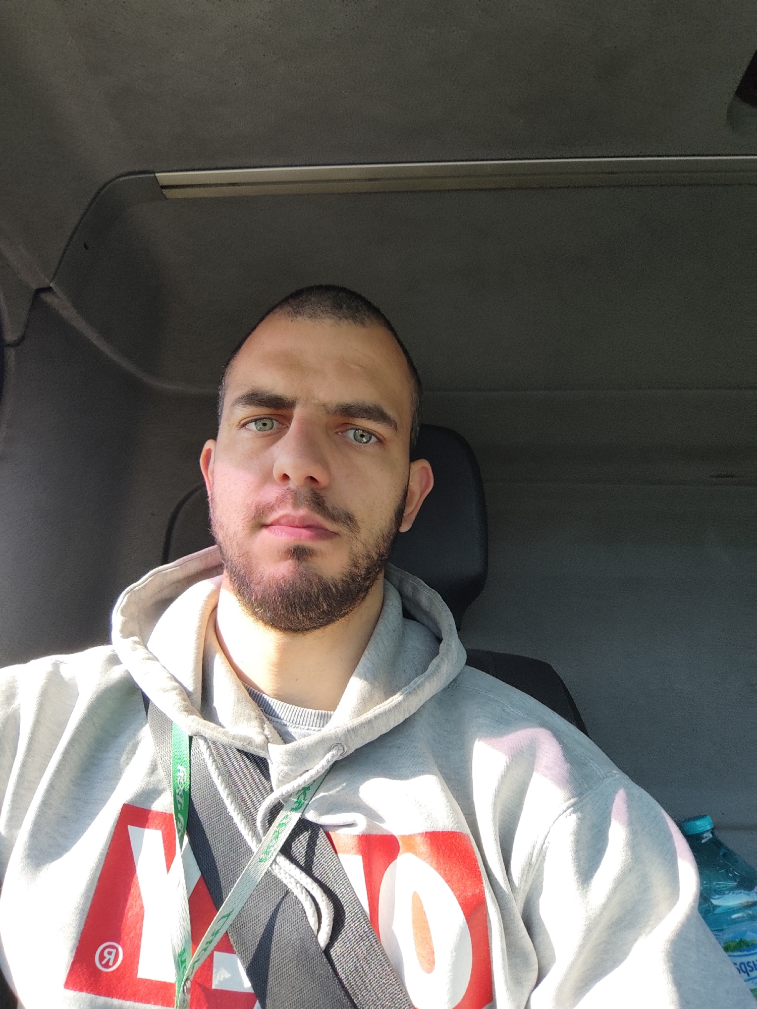 A medium-shot, indoor photograph captures a man wearing a grey hoodie. He is also wearing a seatbelt. A water bottle is visible. The man is likely in a vehicle, based on the surrounding interior. There is no specific evidence to link this image to the city of Byal Izvor, Bulgaria.