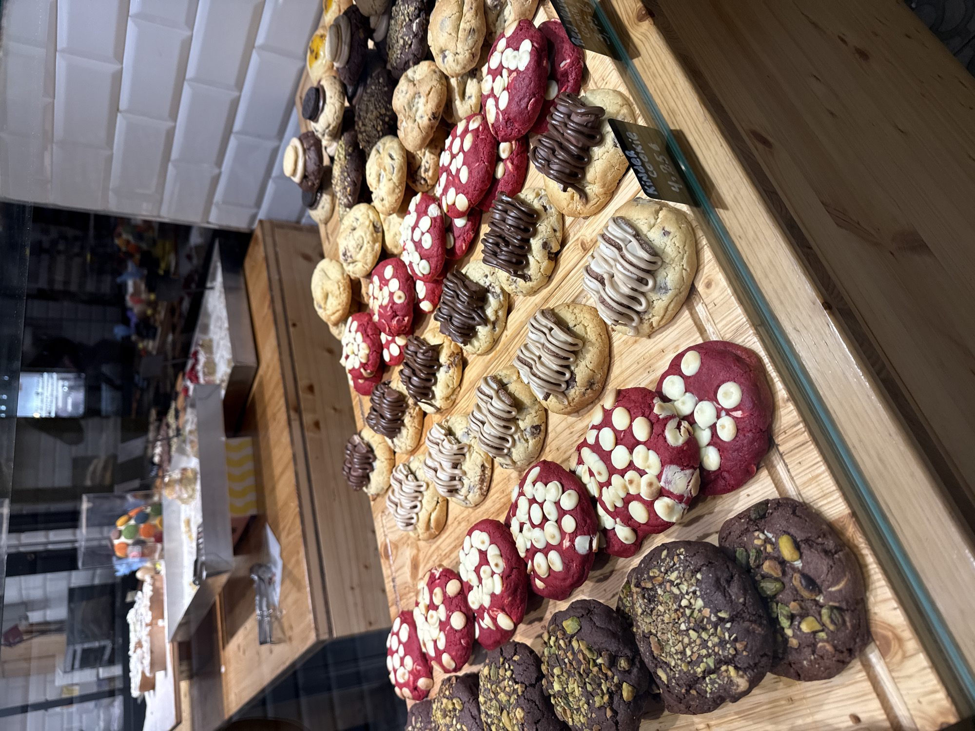 display case filled with assorted cookies in what appears to be a bakery or pastry shop. There are rows of different cookie varieties, including red velvet cookies with white chocolate chips, cookies with chocolate drizzle, and dark chocolate cookies with pistachio toppings. The cookies are arranged on a wooden surface inside a glass display. The background includes a wall tiled with white subway tiles. In the lower-left, a display case with other pastries can be seen. Based on metadata and visual cues, the location is a bakery/pastry shop that could be located in the city of Barcelona, Spain. No people are visible in the frame.