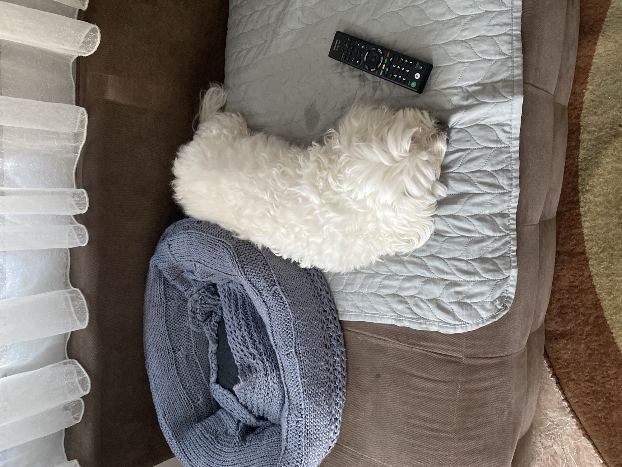 The image depicts an indoor residential scene in Blagoevgrad, Bulgaria. A small, white, long-haired dog with curly fur lies prone on a light gray quilted throw with a leaf-like pattern, which covers part of a brown upholstered couch. The dog's head is positioned towards the bottom of the frame, appearing to be at rest. To the left of the dog, an empty, round, dusty-blue knitted dog bed rests on the couch. A black Sony remote control is situated on the quilted throw to the dog's right. A subtle damp spot or discoloration is visible on the quilted throw near the dog's mid-section. In the background, white sheer curtains hang, indicating a window. The floor below the couch is partially visible, showing sections of a brown and beige patterned rug.