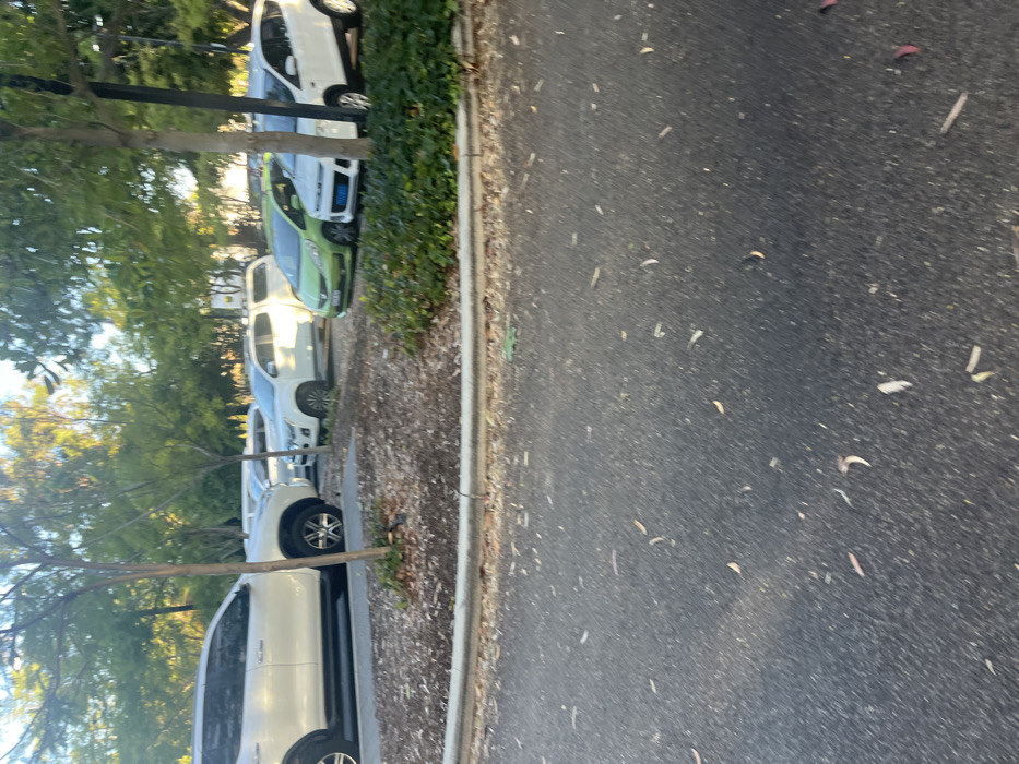 The image presents a ground-level view of a parking area in Applecross, Australia. The immediate foreground is composed of dark grey asphalt, sparsely scattered with light brown and reddish dry leaves. A low, light grey concrete curb runs horizontally across the mid-ground, separating the asphalt from a landscaped median. This median contains dark brown bark mulch with minimal green ground cover and several slender tree trunks. Behind this median, a row of vehicles is parked. From left to right, a white SUV, consistent with a Toyota Fortuner, is partially visible, with its front left wheel positioned on the mulched area. Next to it, a white utility vehicle, appearing to be an Isuzu D-Max, is parked. Adjacent to the utility vehicle is a bright green hatchback, resembling a Honda Jazz or Fit. To its right, a white five-door hatchback, consistent with a Mitsubishi Mirage, displays a blue accessory or cover on its front. Further white vehicles are partially obscured by dense green foliage and trees in the background, which define the perimeter of the parking area. The lighting suggests natural daylight, possibly late afternoon or early morning, casting soft shadows. No individuals are present, and no actions or interactions are observed.