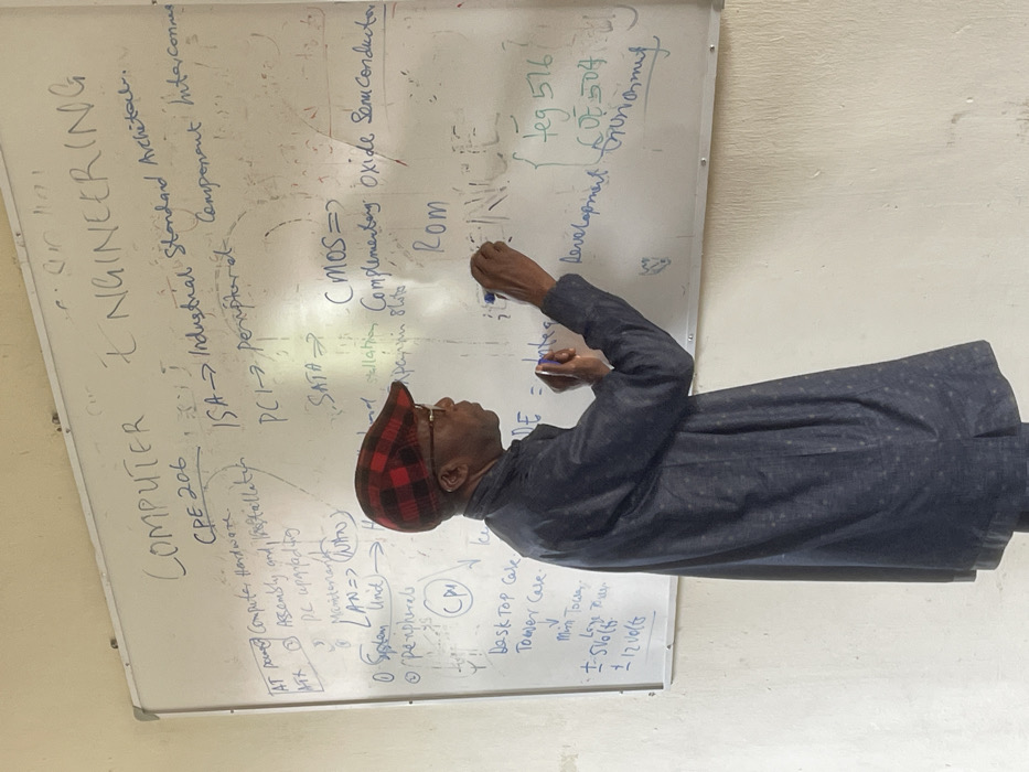 An indoor scene in Uturu, Nigeria, features a male individual standing in profile, facing right, actively writing on a white whiteboard with a blue marker. He is holding a second blue marker in his left hand. The man, appearing middle-aged to elderly with dark skin, wears a red and black plaid flat cap, eyeglasses, and a dark blue patterned long-sleeved tunic over dark trousers. The whiteboard is extensively covered with handwritten technical notes, primarily in blue and black ink, under the prominent heading "COMPUTER ENGINEERING CPE 206." Specific visible topics include "Computer hardware," "Assembly and Installation," "PC upgrading," "Maintenance," "LAN," "System Unit," "Peripherals," "CPU," and definitions such as "ISA -> Industrial Standard Architecture," "PCI -> peripheral," "SATA," and "CMOS -> Complementary Oxide Semiconductor." Other visible, fragmented text includes "ROM," "teg 576," "development," and "environment." The whiteboard exhibits minor smudges and erased residue, indicating prior use. The background consists of a plain, light-colored wall.