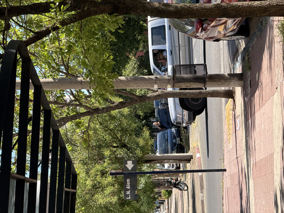 The image displays a daytime street scene on L.N. Alem street in Santa Rosa, Argentina, as indicated by a black street sign with a white left-pointing arrow positioned on the left side of the frame. The foreground features a red and beige checkered tile sidewalk under partial shadow, extending from the bottom left towards the middle distance. A black metal pergola structure is partially visible at the top of the frame. A black pole in the left-midground supports the "L.N. Alem" street sign. Further along the sidewalk, a dark-colored motorcycle is parked. A light-colored utility pole stands prominently in the midground, with a black wire mesh trash receptacle attached at waist height. To the right, a red sedan is partially visible, parked curbside. The asphalt street, visible beyond the sidewalk and utility pole, features red and white painted curbs and a yellow tactile curb ramp. On the street, a silver four-door pickup truck is positioned, possibly moving or stopped, with a person wearing glasses visible in the driver's seat. Behind this truck, a dark-colored Citroën C3 car is parked, its driver-side door open. A male individual with light hair and a dark shirt stands adjacent to the open door of the Citroën C3, facing left. The street is lined with numerous deciduous trees exhibiting green foliage, casting dappled shadows across the scene. Other parked vehicles are partially visible further down the street, obscured by the trees.