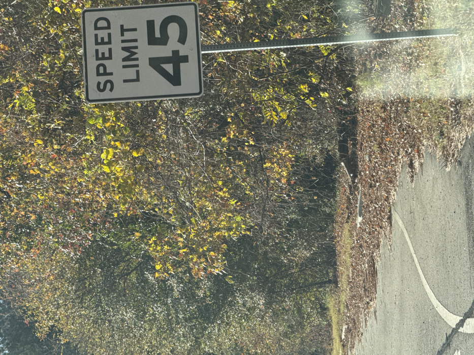 A roadside scene features a 45 mph speed limit sign alongside a rural road. The trees are full of autumn foliage in hues of yellow and brown. The road has a prominent white line and is flanked by fallen leaves and vegetation on the shoulder. The image may be taken from inside of a moving vehicle.