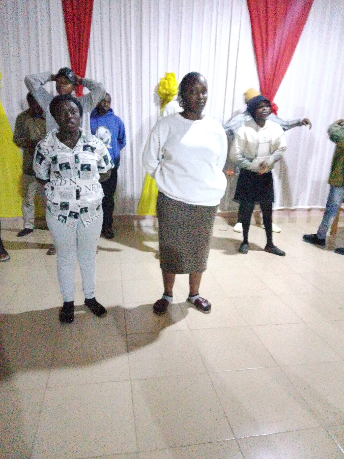 A group of people stand in a room with a tiled floor. Two women in the foreground face the camera. The woman on the left wears a patterned short-sleeved shirt and light-colored pants. The woman on the right wears a white long-sleeved shirt and a floral-patterned skirt. Several other people stand behind them, some partially obscured. Red, yellow, and white curtains hang in the background.