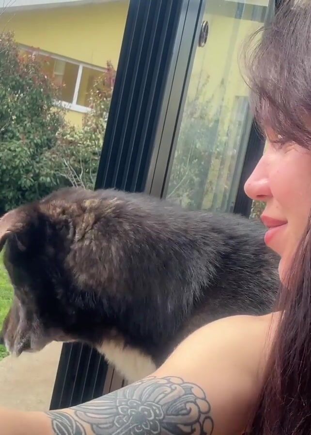 A young woman with long, dark hair, and a tattoo on her left arm looks out a window at a grassy yard with small trees and bushes. A large, dark-haired dog stands next to her, also looking out the window. The woman turns and smiles at the camera, revealing her teeth. Behind the window is a yellow house with a window. The woman is inside a room with glass windows and doors. There are orange plastic chairs in the room. The sky is cloudy.