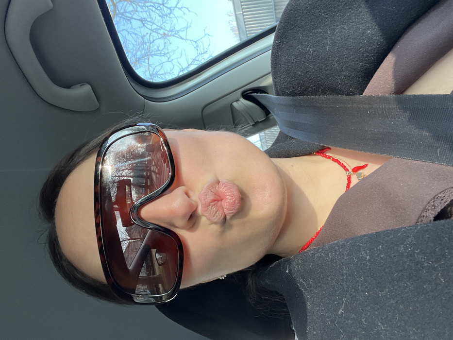 A female individual is depicted from the chest up, seated in the front passenger seat of a vehicle. She wears oversized, tortoise-shell pattern sunglasses and a dark coat, secured by a black seatbelt across her right shoulder and torso. A red beaded necklace, featuring a silver charm and a red chili pepper pendant, is visible around her neck. Her lips are puckered forward in a distinct gesture. The reflective surfaces of the sunglasses display an outdoor scene with bare deciduous trees, a paved roadway, and distant structures under clear daylight. Portions of the vehicle's grey interior, including an overhead grab handle and a headrest, are visible. Through the car's right side window, a clear blue sky with bare tree branches and a light-colored corrugated fence are present. The image is situated in Heilbronn, Germany; however, a specific landmark or precise street location within the city cannot be ascertained from the visual data.