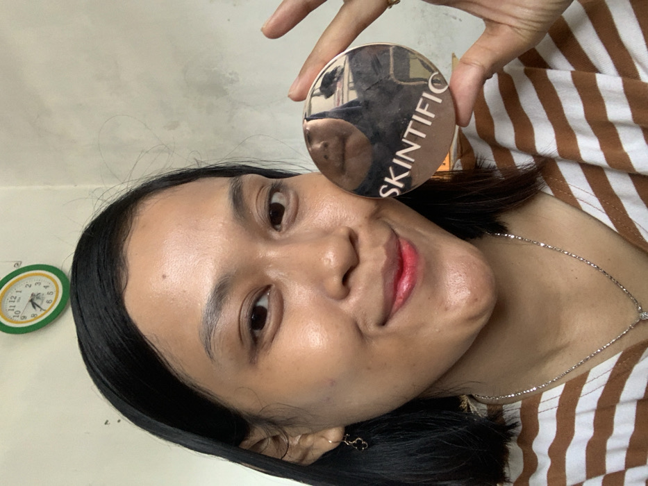 A medium close-up image depicts an adult female subject indoors in what appears to be a residential or domestic setting within Kecamatan Pati, Indonesia. The subject, with dark hair, a light brown complexion, and a subtle smile, is positioned centrally, facing the camera directly. She is wearing a brown and white striped shirt and a silver-colored necklace with a small pendant. A dark-colored, clover-shaped earring is visible on her left ear. She holds a circular, metallic, rose-gold colored compact or container in her right hand, positioned in front of her lower right cheek. The object bears the brand name "SKINTIFIC" in white lettering across its surface. A reflection within the compact shows a partial, distorted image of what appears to be another individual wearing a dark garment. The background consists of a plain, light-colored wall. A circular wall clock with a green frame and white face is visible in the upper left corner of the frame.