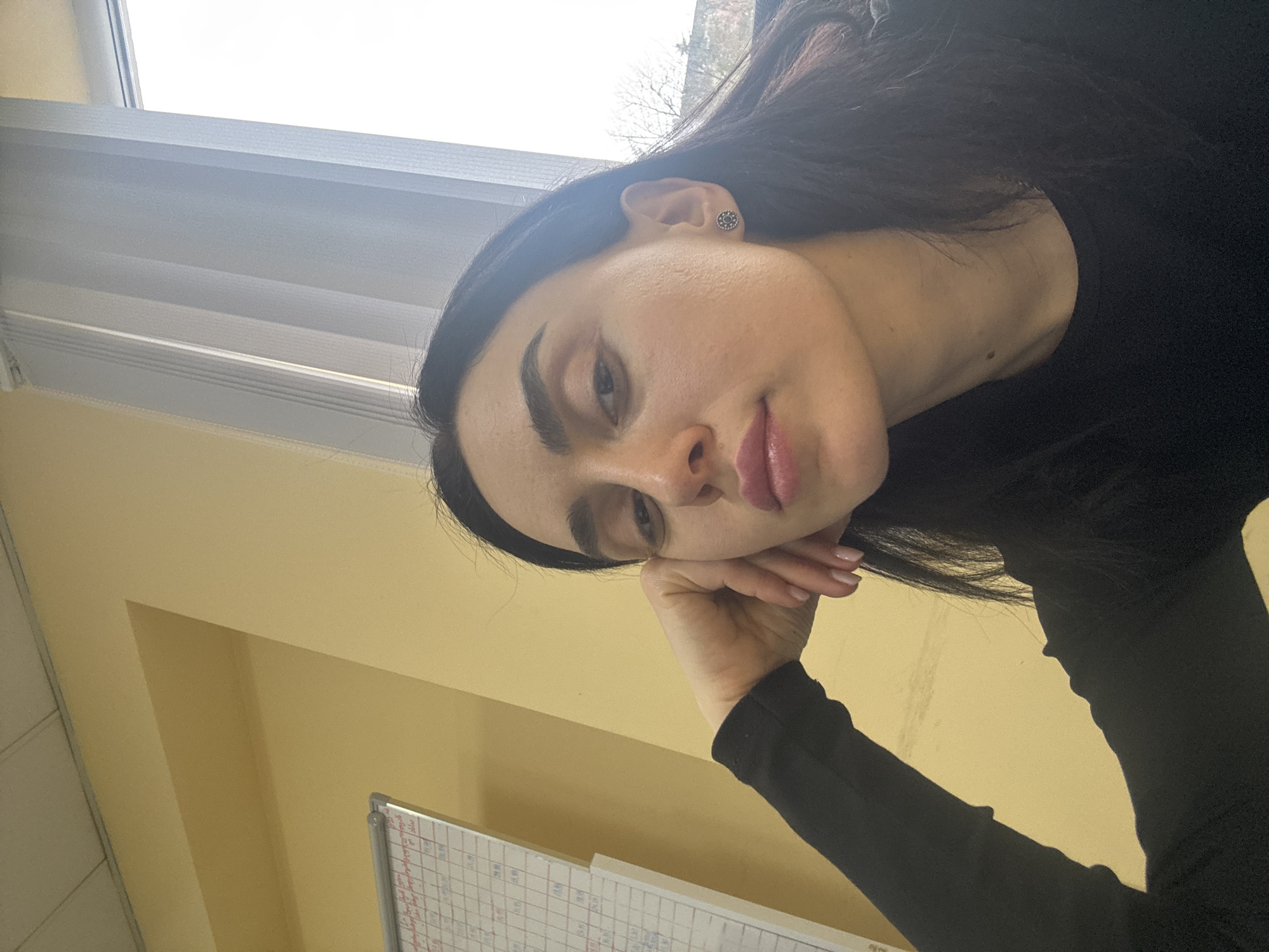 A woman with dark hair is leaning on her hand, near a window with blinds. She has dark eyebrows and pale skin, and is wearing a black top. The background includes a yellow wall and a whiteboard with a grid pattern. It's daytime, based on the light coming through the window. There is no evidence to definitively place the location in Tbilisi, Georgia.