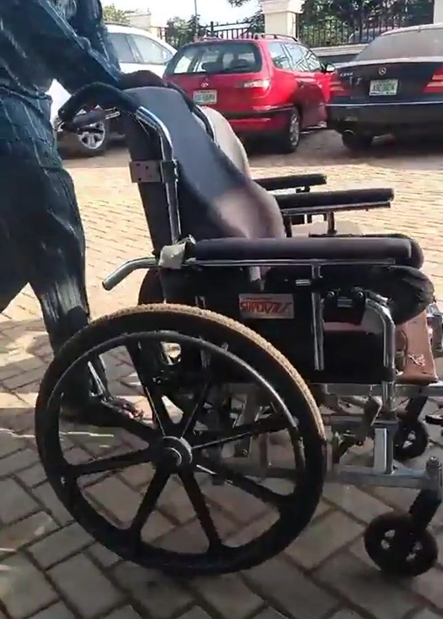 man moving two wheelchairs across a brick paved outdoor area. The man is wearing a striped suit and sandals. He is walking away from the camera, pushing the wheelchairs in front of him. There are several cars parked in the background, including a white SUV, a red sedan, and a silver sedan. The environment appears to be a driveway or parking area, possibly at a clinic or hospital. The sky is bright, suggesting it is daytime.