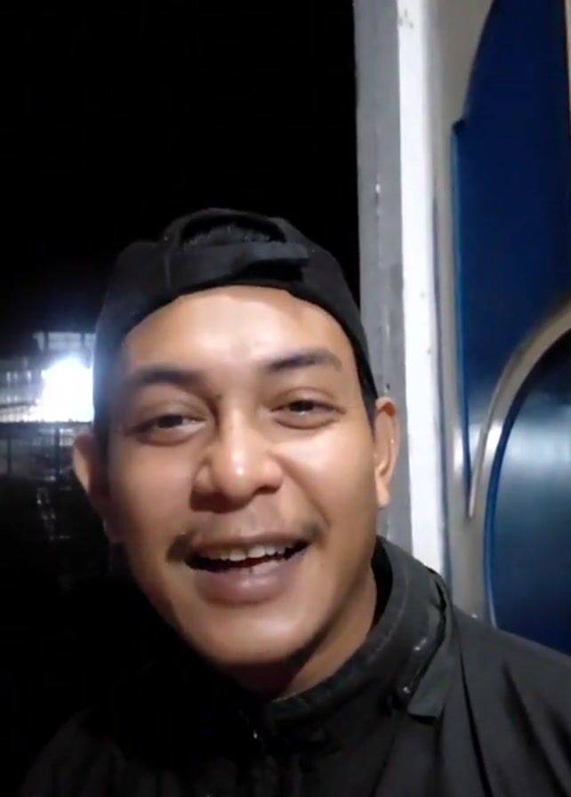 A man with brown skin and a black cap stands facing the camera. He has a mustache and is wearing a black jacket. He is smiling and talking to the camera. Behind him is a white pillar next to a door painted blue and white. The background behind the door is dark.