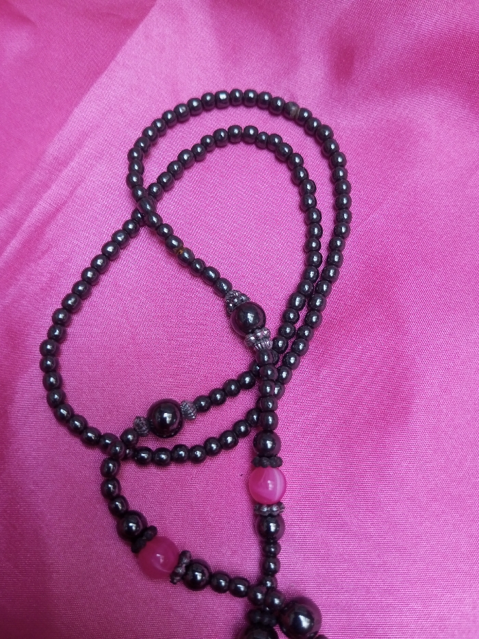 - "A rosary-style string of prayer beads is depicted resting on a vibrant pink fabric, likely satin or silk, which displays subtle folds and highlights" by FM-8grqY2, licensed under CC BY 4.0