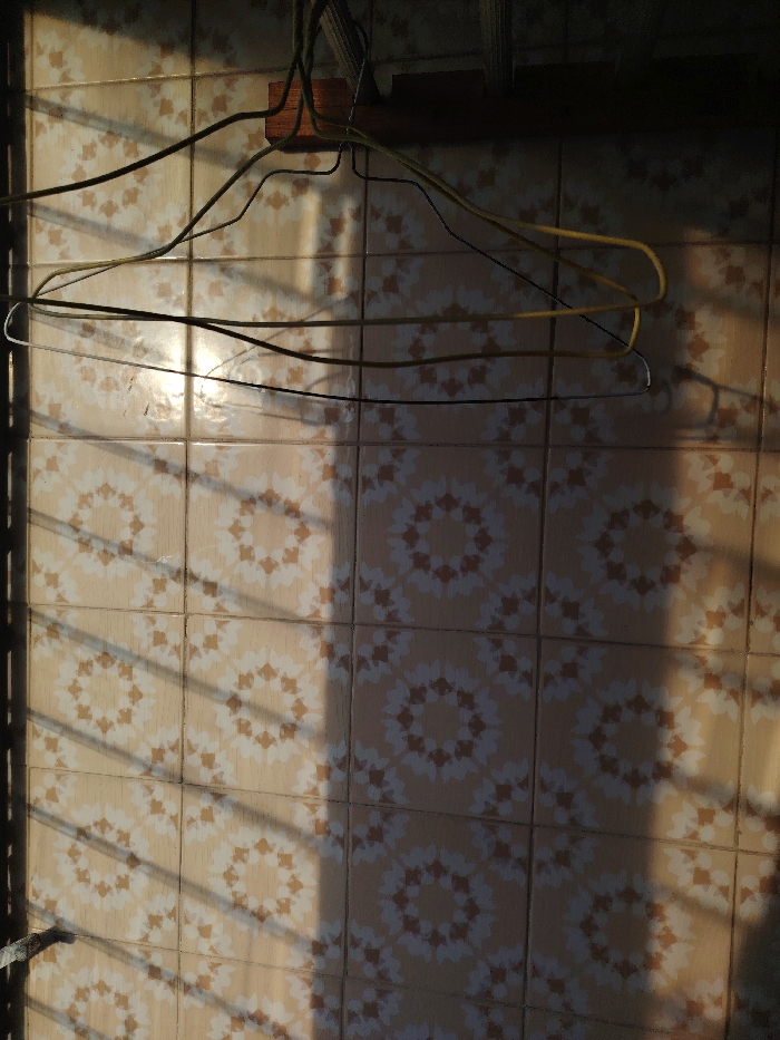 - "The image displays two wire clothes hangers centrally positioned against a tiled wall" by FM-DCPKH3, licensed under CC BY 4.0