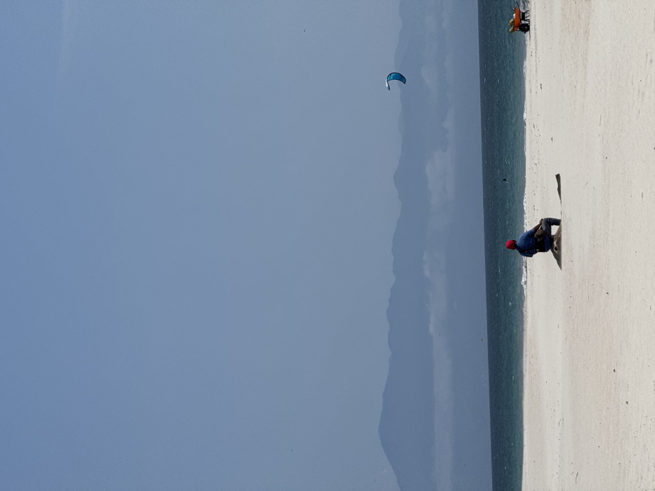 This image depicts a wide, light-colored sandy beach in La Cruz de Huanacaxtle, Mexico, under a clear, pale blue sky. A distant, hazy blue-grey mountain range with low-lying clouds forms the horizon above a dark blue ocean exhibiting moderate wave activity. In the midground, a lone individual wearing a red cap, blue shirt, and dark pants is seated on a dark, weathered log or tree stump, facing away from the camera towards the ocean and mountains. A dark shoulder bag is visible on the person. To the right, above the ocean, a blue and white kiteboarding kite is airborne. Further right, closer to the water's edge, an orange wheelbarrow containing several yellow, round objects is present on the sand.
