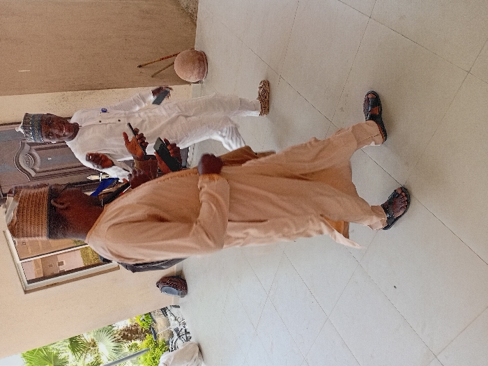 The image displays an indoor-outdoor transitional area within a building complex, featuring light-colored tiled flooring and plain beige walls. Two adult males are observed in motion, with a third individual partially visible in the background. The man in the foreground, positioned on the left and facing towards the right, wears a light tan tunic and trousers, dark sandals, and a woven light brown cap. He carries a dark backpack and holds two dark-colored smartphones in his left hand. The man in the midground, on the right, walks towards the camera, smiling broadly. He is dressed in a white tunic and trousers, light brown woven flat shoes, and a patterned white and black cap. A blue pin is visible on his left chest, and he holds a dark smartphone in his left hand. A third person, largely obscured, is visible between the two main subjects, wearing blue attire. In the background, a brown paneled door is centered. To its left, a window with dark frames reveals outdoor foliage and a white object. To the far right, a spherical terracotta pot rests on the floor with two slender wooden sticks leaning against the adjacent wall. The scene is brightly lit by natural light. The architectural style and traditional attire are consistent with a location in Nigeria. The specific city of Kwazailewa is not discernible from the visual evidence.