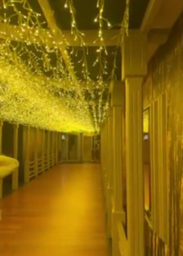 A static shot shows a well-lit hallway adorned with numerous yellow string lights overhead. The lights create a dense, glowing canopy effect. The hallway has a wooden floor, and the walls are decorated with a vertical forest-themed pattern. On the right side of the hallway, there are white pillars connected by a white railing. A person wearing a white jacket and dark pants walks away from the camera down the hallway. The overall atmosphere is warm and inviting due to the color and arrangement of the lighting.