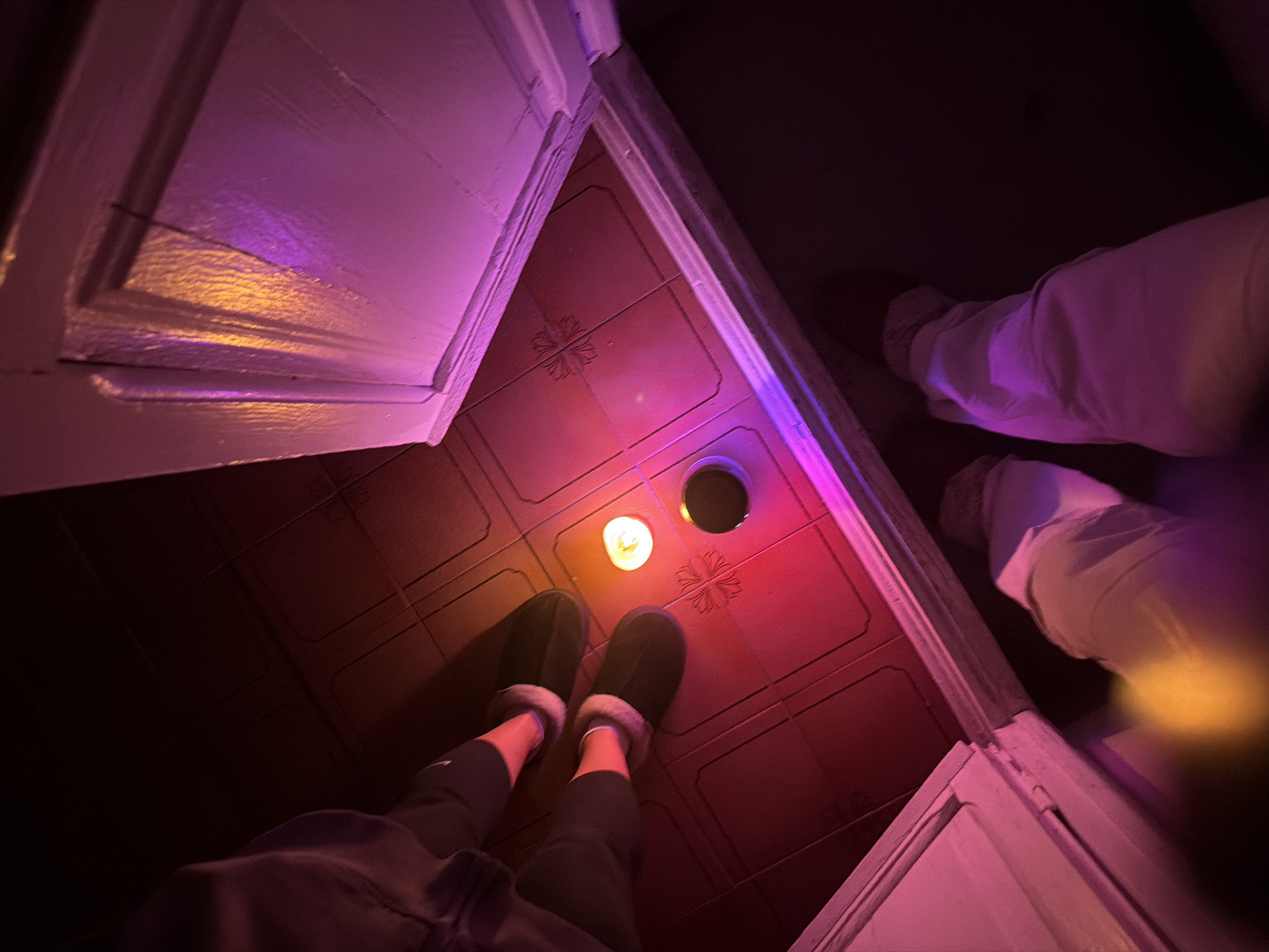 An indoor scene in Valencia, Spain, is captured from a high-angle perspective, dominated by magenta ambient light with a central yellow-orange glow. The setting features a terracotta-colored tiled floor, some tiles embossed with a quatrefoil-like pattern. Two individuals are present, their lower bodies visible. On the upper-left, a person wears dark trousers and dark, fur-lined slippers. On the lower-right, another person wears light-colored trousers and light-colored, fur-lined footwear. Between them, on the floor, rests a small, round object emitting a yellow-orange light, likely a tea light, next to a dark, circular, reflective object. White door frames are visible on both sides, with a partially open white paneled door on the right reflecting the colorful illumination.