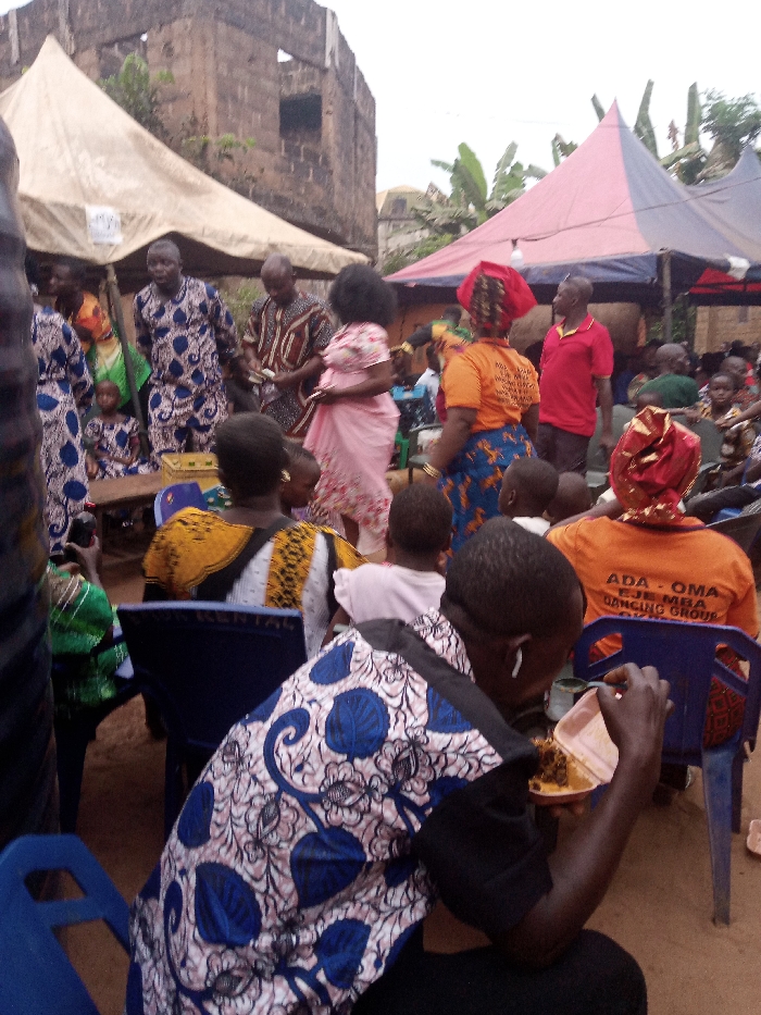 A crowded outdoor event with tents is underway. Many people are seated and standing, some in matching patterned attire. A woman in pink walks amidst the crowd. The foreground shows people seated on blue plastic chairs; one is eating from a plate. Behind them, people wear orange shirts with the text "ADA - OMA EJE MBA DANCING GROUP". The setting appears to be a community gathering or celebration.