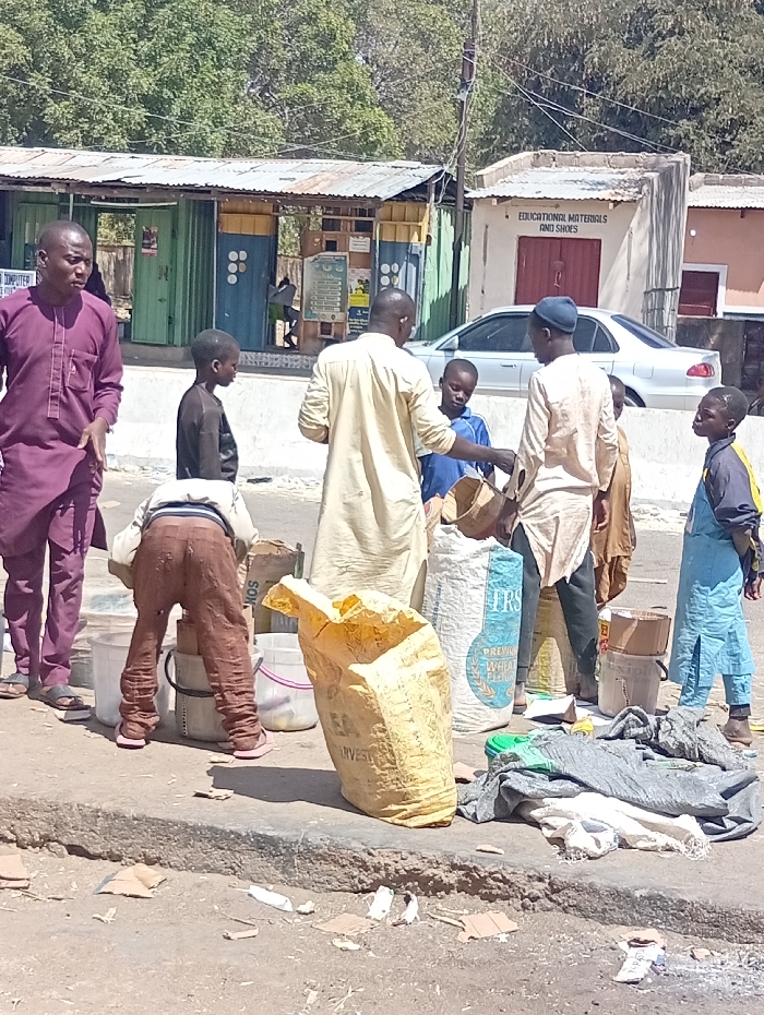 This image depicts an outdoor commercial or market scene in Zango, Nigeria, under bright daylight