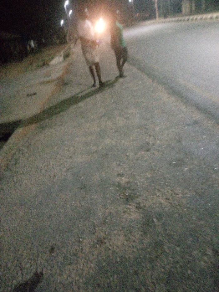 An outdoor shot at night shows two figures on the edge of a road. The person on the left appears to be wearing lighter clothing and the one on the right, darker clothes. Headlights illuminate them from the front. The road stretches into the distance, with sporadic lights lining the far side. The foreground consists of the sidewalk.
