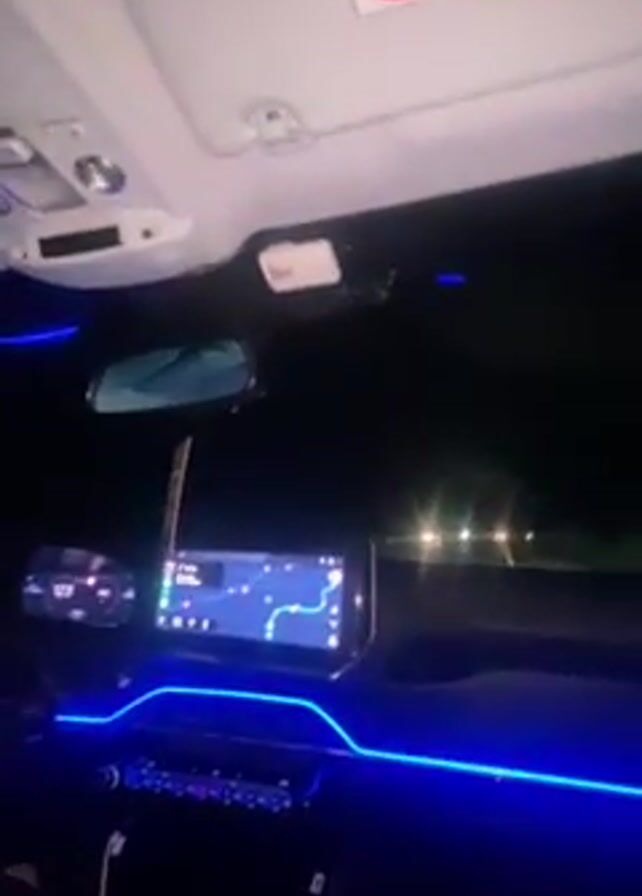 interior of a car at night. The dashboard is lit with blue LED lights. There is a navigation system on the center console screen. A person is seen holding the steering wheel and driving the car. The environment is dark and only visible through the windshield are streetlights and passing cars.