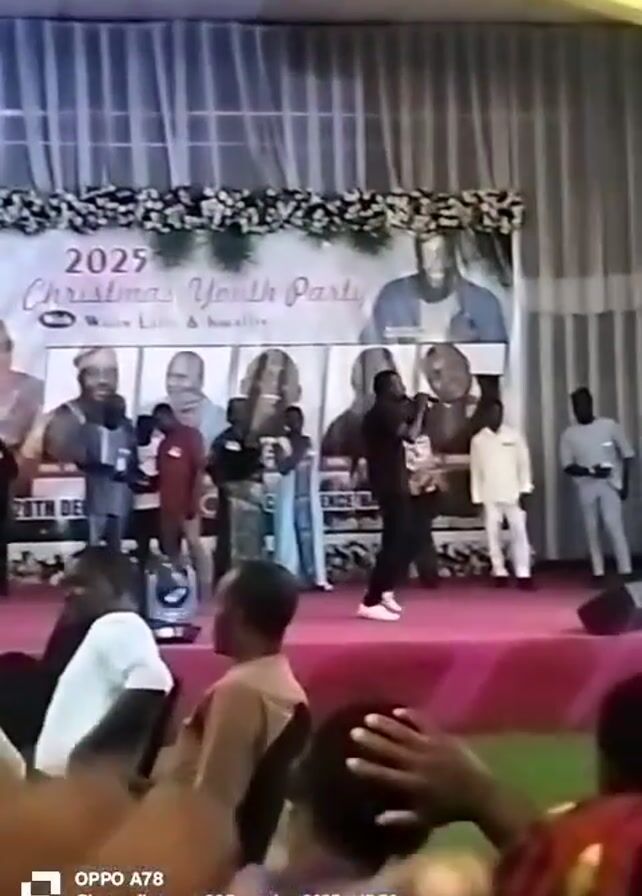 A camera faces a stage with a backdrop banner reading "2025 Christmas Youth Party
