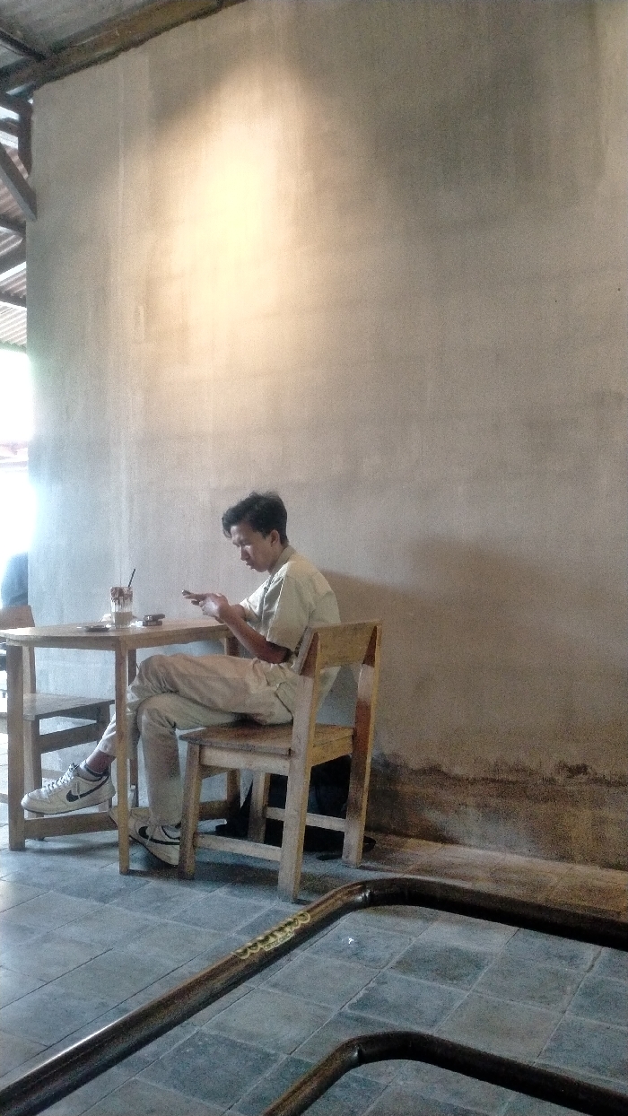 An indoor scene in Malang, Indonesia, depicts a young male seated at a light-colored wooden table. The male, with dark hair, wears a light-colored short-sleeved collared shirt, light-colored long pants, and white Nike sneakers with black swooshes. He is actively engaged with a dark-colored smartphone, holding it with both hands and looking down at the screen. On the table, to his left, is a glass containing an iced beverage with a straw and a topping, alongside a small, dark cylindrical object. The man is seated on a light-colored wooden chair, with another similar chair partially visible on the opposite side of the table. The background features a textured, light gray concrete or stucco wall, illuminated by a bright, yellowish light source on the upper left, creating a large, diffused glow. The lower part of the wall exhibits darker discoloration. The floor is covered with gray square tiles. In the immediate foreground, a dark, U-shaped metal bar structure rests on the floor, featuring yellow lettering that reads "coffee cafe." In the upper left background, wooden beams and corrugated metal roofing are visible, suggesting an open or industrial-style ceiling. A bright external light source is visible on the far left, silhouetting an indistinct shape. No direct interactions are occurring.