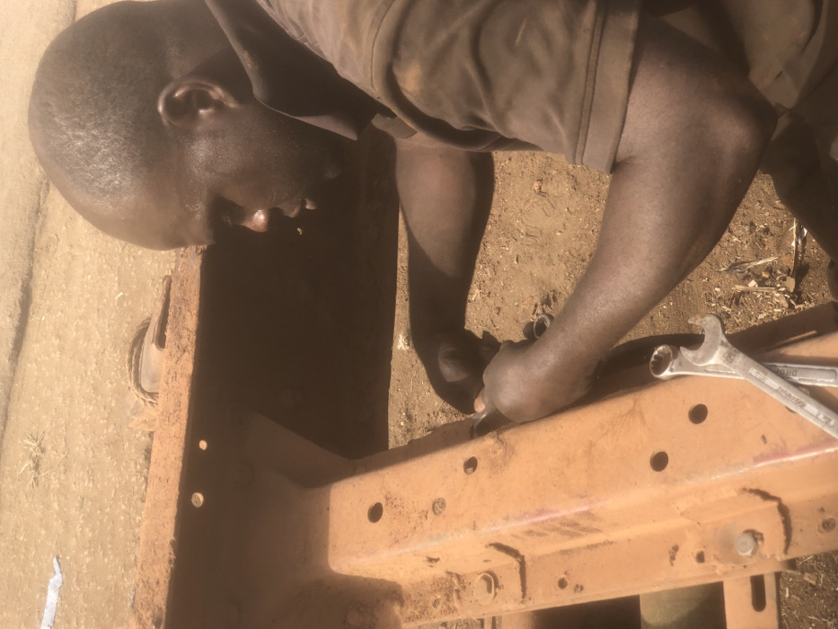 A dark-skinned male, observed in profile, is actively engaged in mechanical work on an outdoor, unpaved surface in Kufena, Nigeria
